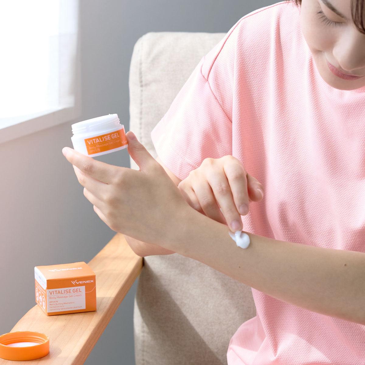 ストレッチや筋肉の流れに沿ってマッサージするのがおすすめです。伸びのよいジェルが角質層まで浸透します。