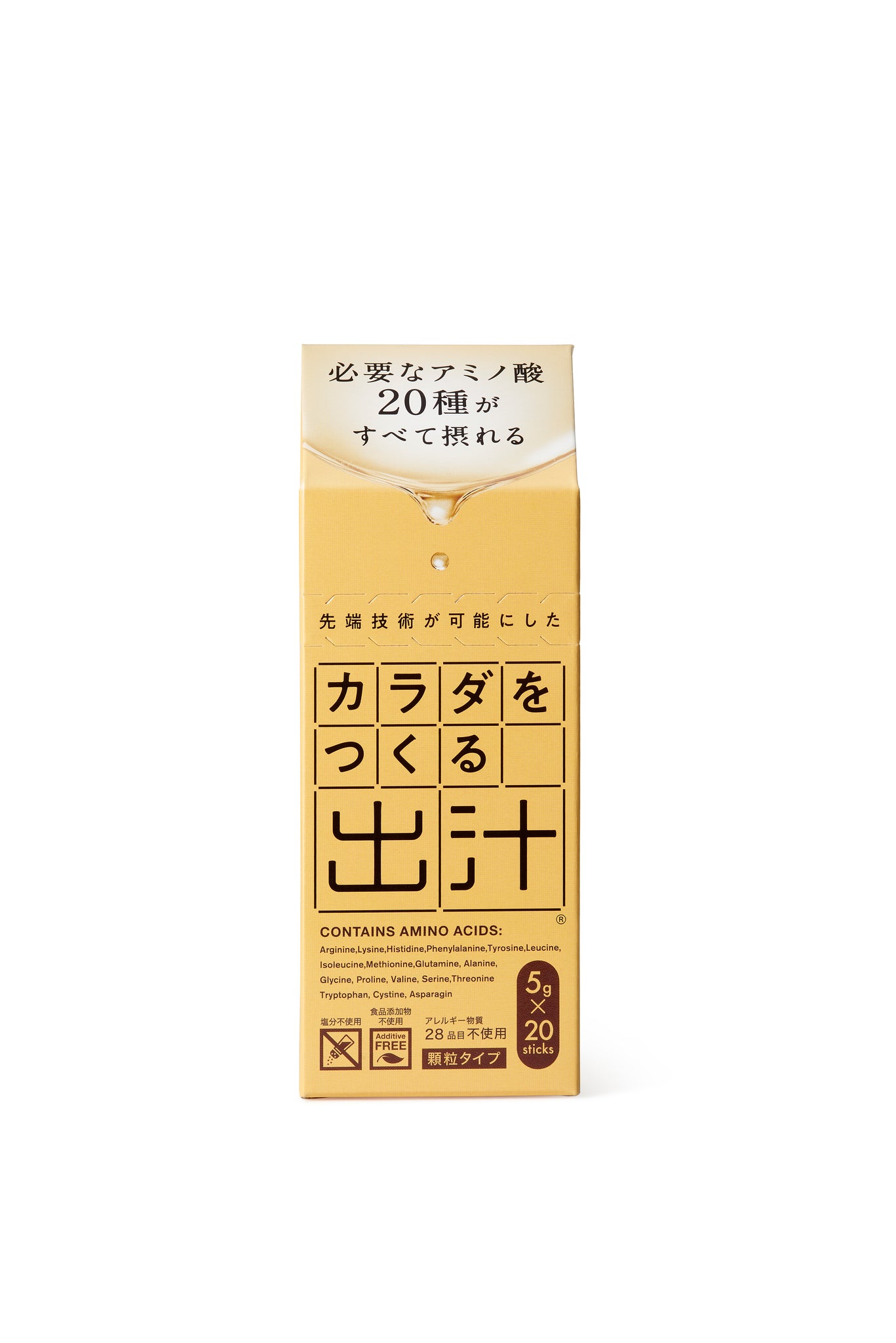 スティック1本(5g入)で必要なアミノ酸20種すべて摂れる。