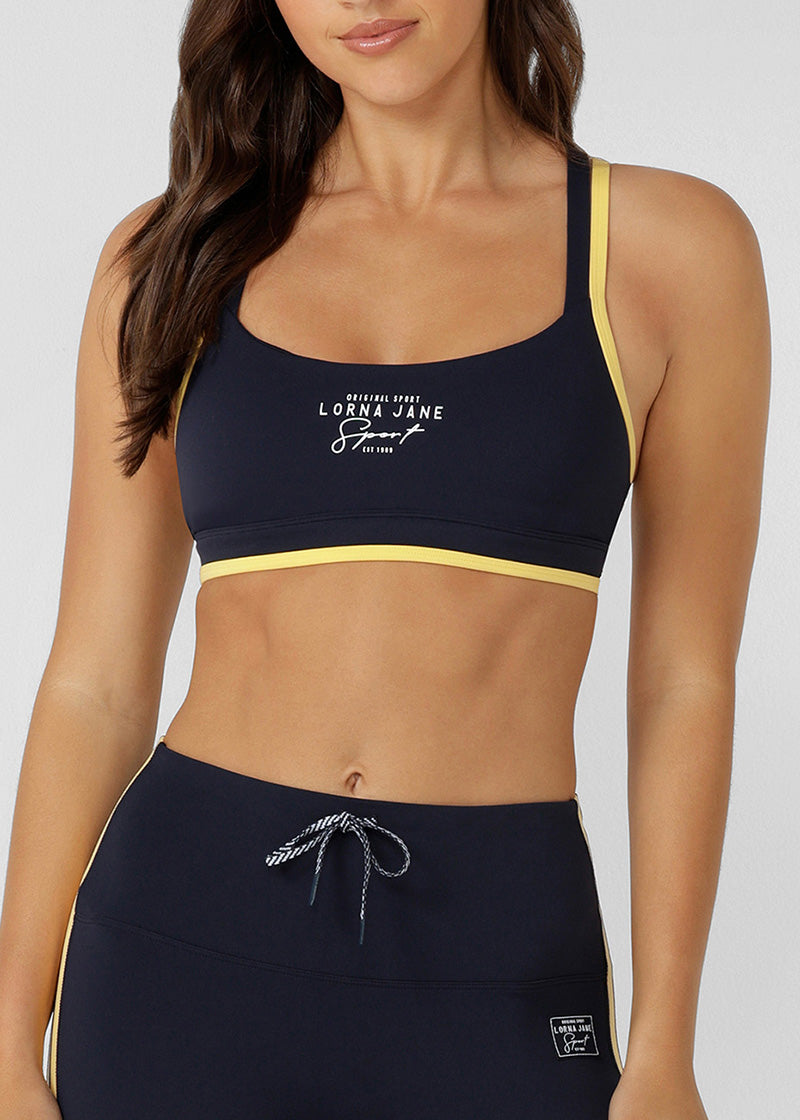 動きやすくて、見た目も爽やか。ネイビー×イエローのアクセントが映えるスポーツブラ。