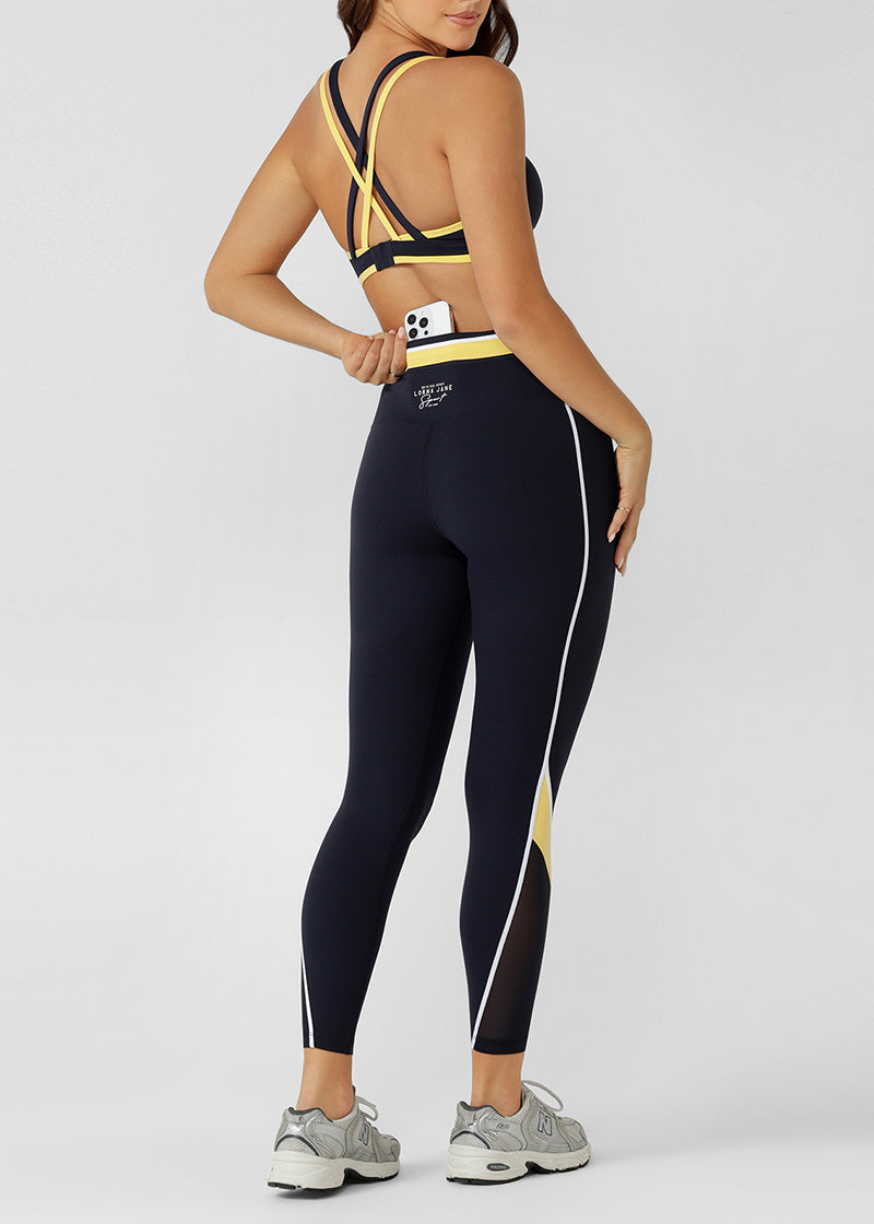 ネイビーにイエローの差し色を効かせた、スポーティで印象的なデザインのスポーツブラ。