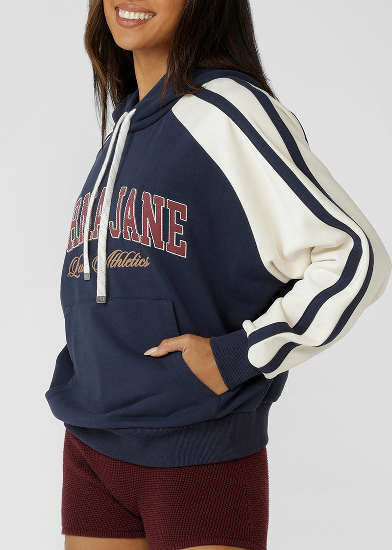 全体はゆとりのあるシルエットで、気負わず着られるバランス。レトロスポーツをイメージした配色パネルが、シンプルな中にさりげないアクセントを添えます。